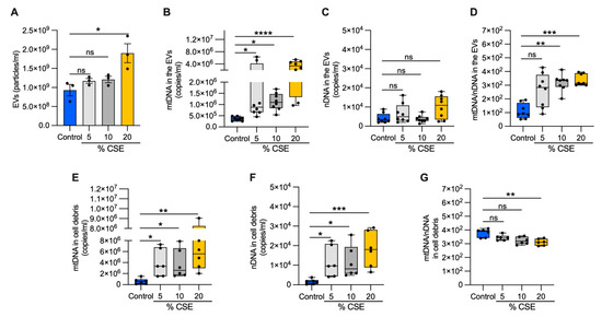 Exposure to CSE promotes mtDNA release in EVs. (A) Bar graph showing the EV number (particles/mL) isolated from the extracellular milieu of BEAS-2B exposed for 24 h to CSE exposure; box and whisker plots of the (B) mtDNA and (C) nDNA contents; (D) the mtDNA/nDNA ratio from isolated EVs as well as the (E) mtDNA and (F) nDNA content; (G) the mtDNA/nDNA ratio from isolated cell debris. (A) Data are shown as mean ± SEM of independent experiments indicated as a circle (n = 3). (B–G) In the box and whisker plot, each circle represents the value of an independent experiment (n ≥ 6). CSE, cigarette smoke extract; control, CSE-unexposed cells. (A–G) ns, no statistical significance; * p < 0.05, ** p <0.01, *** p < 0.001, **** p < 0.0001 were determined by one-way ANOVA with multiple comparisons and Kruskal–Wallis’s test relative to the control.