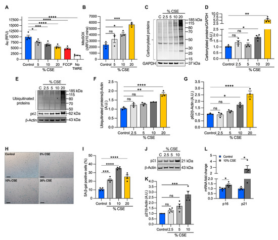 CSE affects mitochondrial membrane potential (∆ψ), promotes oxidative stress, and induces replicative senescence. (A) Bar graph reporting the ∆ψ as relative fluorescence unit of BEAS-2B cells exposed for 6 h to CSE and incubated for 20 min with 250 nM tetramethylrhodamine ethyl ester (TMRE). Cells incubated without TMRE or with 20 µM carbonyl cyanide p-trifluoro-methoxyphenyl hydrazone (FCCP) were used as negative and positive controls, respectively; (B) bar graph reporting the superoxide anion production as the variation of the relative fluorescence unit (RFU) of MitoSOX over 10 min in BEAS-2B cells exposed for 3 h to CSE. Representative Western blots showing total (C) carbonylated and (E) ubiquitinated proteins, (E) p62 and (J) p21 proteins in BEAS-2B cells exposed for 24 h to CSE. GAPDH or β-actin proteins were used as a loading control. Bar graphs report the densitometry of total (D) carbonylated and (F) ubiquitinated proteins, and (G) p62 and (K) p21 proteins; (H) representative micrograph images and (I) quantification (percentage of total cells) of senescent-associated β-galactosidase positive cells after 24 h of exposure to CSE. Scale bar = 100 µm; (L) bar graph reporting the gene expression of p16 and p21 in cells exposed for 24 h to a sublethal dose (10%) of CSE as compared with the control. (A,B,D,F,G,I,K,L) Data are shown as mean ± SEM of independent experiments (n ≥ 3) indicated as circles. CSE, cigarette smoke extract; control, CSE-unexposed cells; ns, no statistical significance; *p < 0.05, ** p < 0.01, *** p < 0.001, **** p < 0.0001, (A,B,D,F,G,I) by one-way ANOVA analysis as compared with the control with Bonferroni post hoc test, or (K) Kruskal–Wallis post hoc tests, and (L) unpaired t-test with Mann–Whitney analysis.