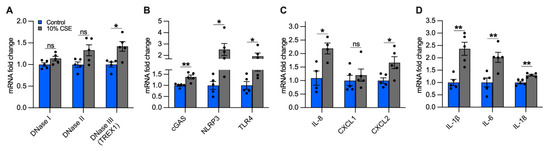 A sublethal dose of CSE upregulates the expression of DNase III, DNA-sensing receptors, and cytokines involved in neutrophil and macrophage recruitment. Bar graphs reporting the gene expression in cells exposed for 24 h to a sublethal dose of (10%) CSE as compared with the control: (A) DNases I-III, (B) cGAS, NLRP3, TLR4, (C) IL-8, CXCL1, CXCL2, and (D) IL-1β, IL-6, IL-18. Data are shown as mean ± SEM of independent experiments (n ≥ 4), indicated as circles. CSE, cigarette smoke extract; control, CSE-unexposed cells. ns, no statistical significance; * p < 0.05, ** p < 0.01 were determined by an unpaired t-test analysis with Welch’s correction.
