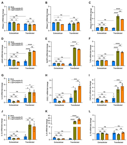 Transfected synthetic DNA upregulates the expression of DNase III, DNA-sensing receptors, and cytokines involved in neutrophil and macrophage recruitment. Bar graphs reporting the gene expression in cells exposed for 12 h to 1 or 2 µg/mL of synthetic DNA added directly to the growth medium (extracellular) or transfected using a cationic lipid-based transfection reagent (transfected): (A–C) DNases I-III; (D–F) cGAS, NLRP3, TLR4; (G–I) IL-8, CXCL1, CXCL2; (J–L) IL-1β, IL-6, IL-18. Data are shown as mean ± SEM of independent experiments (n = 3), with each experiment indicated as a circle. ns, no statistical significance; * p < 0.05, ** p < 0.01, *** p < 0.001, **** p < 0.0001 were determined by two-way ANOVA with multiple comparisons.