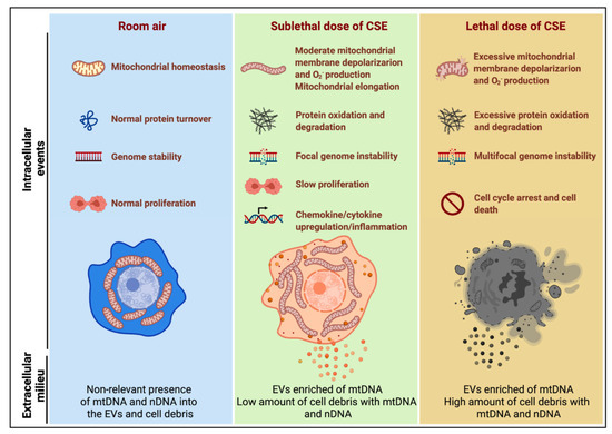 Model summarizing the effects of sublethal (10%) or lethal (20%) doses of CSE with extracellular mtDNA and nDNA release. A sublethal dose of CSE promoted moderate mitochondrial membrane depolarization, increased superoxide (O2−) production and oxidative stress, slowed cell proliferation, and triggered mtDNA release by extracellular vesicles (EVs). This condition is exacerbated in cells exposed to a lethal dose of CSE, in which mtDNA and nDNA are mainly released by the high amount of cell debris.