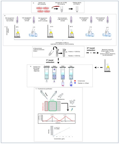 Summarized scheme of InPeps extraction from HEK293 cells. (a–c) Sub-confluent HEK293 cell cultures were resuspended and homogenized in defined conditions, sonicated, centrifuged, and placed into Amicon® Ultra 4 mL low-binding 10,000 Da size-exclusion filter membranes (Merck-Millipore, Burlington, MA, USA). (d) The flowthrough was collected and stored at −20 °C before quantification; InPeps present on this material were considered from “first round” of extraction. The material retained in the 10,000 Da size-exclusion filter membranes was removed by rinsing with ultrapure water, heated at 80 °C for 5 min to denature proteins, acidified with 6N HCl after been ice cold, and stored at −20 °C before quantification; InPeps present on this material were considered “second round” of extraction. (e) Stored samples were thawed on ice and applied to Oasis HLB columns for peptide purification as per manufacturer’s instructions. After being dried into a speed vacuum concentrator (Eppendorf, Hamburg, Germany) and resuspended in ultrapure water (60 μL). (f) Fluorescamine was used for peptide quantification, as previously described [,]. Phosphate buffered saline, pH 7.4 (PBS).