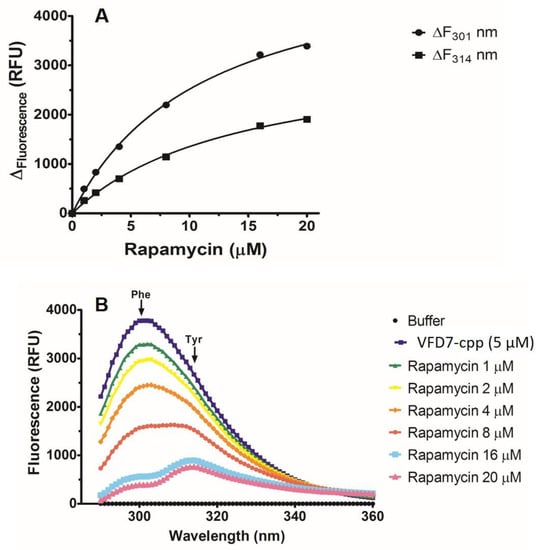 These experiments were performed to evaluate the possible direct molecular interaction between VFD7-cpp and rapamycin, which could interfere with the results observed on the PPI complementation assay within cells. Variations of the intrinsic fluorescence emission of the peptide VFD7-cpp (5 µM) as a function of the rapamycin concentration (0–20 µM), in a 20 mM Tris-HCl buffer, pH 7.5 at 25 °C, were determined. The peptide was excited at 275 nm, and its emission spectrum was analyzed between 290 and 360 nm in a Shimadzu RF-6000 spectrofluorometer (Shimadzu Corporation, Kyoto, Japan).