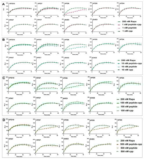 HEK293 cells (approximately 104) cultured in a 96-well plate in DMEM high-glucose medium, supplemented with 10% FBS and 1% penicillin/streptomycin, were transiently co-transfected with 200 ng of both FRB-pBiT and FKBP-SmBiT vectors (NanoBiT® PPI Control Pair FKBP, FRB; catalog number N2016, Promega, Madison, WI, USA); this final plasmid concentration of 200 ng was defined previously testing different plasmid concentrations, as shown in Supplemental Figure S1A. The transfected cells were incubated in Opti-MEM® I Reduced Serum Medium culture medium (Gibco, Gaithersburg, MD, USA) for 2 h and then treated with 200 nM of rapamycin (BPSBioscience, CAS 53123-88-9, San Diego, CA, USA) diluted in Opti-MEM®/0.01% DMSO (Gibco, Gaithersburg, MD, USA; this rapamycin concentration of 200 nM was defined previously testing different concentrations, as shown in Supplemental Figure S1B). The indicated concentration of peptides was added simultaneous with the rapamycin; after 30 min a booster with the same initial concentration of the indicated peptide was added to the cells, because previous studies have suggested the short half-life of many peptides within cells []. After adding the rapamycin and peptides, Nano-Glo Live Cells substrate (Promega, Madison, WI, USA) was added, and the luminescence was measured for 60 min in a Centro LB 960 Microplate luminometer (Berthold Technologies, Bad Wildbad, Germany) and displayed in relative light units (RLU). Graphs of RLU versus time were plotted by GraphPad Prism (GraphPad, San Diego, CA, USA). Control experiments were conducted using VFD10 and VFD7 without cpp covalently bound, in addition to cpp alone (Supplemental Figure S2).