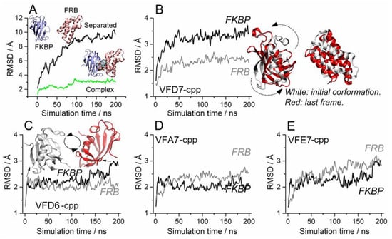 Proteins displacement from RMSD analysis considering the (A) the pre-formed FKBP–rapamycin–FRB complex (green line) and the separated chains of FKBP and FRB in a solution containing both rapamycin and VFD7-cpp (black line). The detailed RMSD values for FKBP (black line) and FRB (gray line) were presented as follows: (B) VFD7-cpp; (C) VFD6-cpp; (D) VFA7-cpp; and (E) VFE7-cpp. Note that VFD7-cpp seems to alter substantially the initial conformation of FKBP, with comparatively less disturbance promoted on the FRB; a slight FKBP rotation was induced by VFD6-cpp, as seen around 175–200 ns.