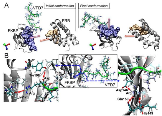 FKBP rotation promoted by the VFD7-cpp peptide. (A) shows the misalignment of the FKBP–FRB interfaces; expected contact residues are highlighted on the surface according to the previous study [], and (B) shows the hydrogen interactions which attach the peptide close to FKBP binding interface.