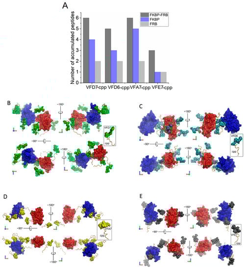A direct approach to understanding the effects promoted by VFD7-cpp, VF67-cpp, VFA7-cpp, and VFE7-cpp could be to evaluate the direct protein–peptide interactions. In this sense, possible VFD7-cpp, VF67-cpp, VFA7-cpp, and VFE7-cpp interactions on FKBP–FRB protein surfaces were investigated and expressed as the average number of peptide molecules close to the proteins (Figure 7A). These data suggest that the number of accumulated peptides binding to the individual or complexed proteins do not match the inhibitory effects observed in HEK293 cells (i.e., VFA7-cpp shows the larger number of peptides binding per protein). Thus, binding to a specific domain (i.e., involved on the rapamycin-induced FKBP–FRB interaction) seem more relevant than the number of binding sites. Despite the frequent interactions observed for all peptides, mainly on the FKBP domain (Figure 7A), the previous RMSD analysis of proteins’ conformational changes show an important rotation of the FKBP structure promoted by VFD7-cpp (Figure 5B) and also a minor one for VFD6-cpp at the end of the MD trajectory (Figure 5C). Moreover, direct protein–peptide interactions suggested that VFD6-cpp binds at the FKBP–FRB interaction domain (Figure 7C). These data could corroborate the greatest potency observed for VFD6-cpp inhibiting rapamycin-induced FKBP–FRB interaction within HEK293 cells. The cpp segment used for the internalization of the peptides into HEK293 cells was frequently observed in a well-oriented conformation to the protein surfaces, especially on the FKBP–FRB interface (Figure 7B–E). This behavior can be understood from the hydrophobicity of both the FKBP–FRB interfaces [,] and the cpp complementary portion of the peptides containing the non-polar residues valine, phenylalanine, and leucine. Taken altogether, MD simulations suggest a steric mechanism of inhibition caused by the peptides binding to FKBP and FRB interaction domains. Consequently, in the presence of peptides such as VFD7-cpp or VFD6-cpp, rapamycin could fully induce FKBP–FRB complex formation, making it less effective in inhibiting mTORC1 kinase activity.