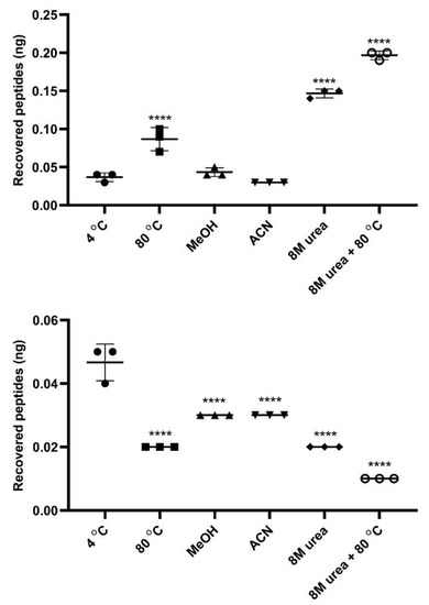 In agreement with MD simulations shown above, previous reports suggest the association of InPeps to macromolecular components of the cells, which could contribute to understanding both their intracellular proteolytic stability and biological significance inhibiting PPI within living cells [,,]. Next, to gain further insights into the proteolytic stability and biological significance of InPeps by possibly interacting with macromolecular components of the cells (i.e., proteins and/or nucleic acids), peptide extractions from HEK293 total lysates, slightly modified from previous descriptions [,,,], were conducted in two rounds. In the first round, peptide extraction from HEK293 cell homogenates was evaluated in the flow-through of the 10,000 Da size-exclusion membranes. During the second round, peptide extraction from HEK293 cell homogenates was evaluated on the material retained on the 10,000 Da size-exclusion membranes (schematized in Figure 1). During the first round of extractions, highest recoveries of peptides obtained in the flow-through were from conditions that denature protein structure (i.e., 80 °C, 8M urea at room temperature, and 8M urea at 80 °C) compared to extractions conducted with PBS at 4 °C (4 °C; smoothest extraction condition), methanol (MeOH), or acetonitrile (ACN) at room temperature (Figure 8). Conversely, the opposite was observed during the second round of extraction, which used the material retained in the 10,000 Da size-exclusion membranes during the first round of extraction. Thus, the highest recovery of peptides from the 10,000 Da size-exclusion membranes was obtained from those membranes used to filter the peptides extracted with PBS at 4 °C (Figure 8). Similar results were obtained extracting peptides from mice brain, spleen, or liver tissues (data not shown). These results support a model that within cells InPeps exist mainly associated to macromolecular components of the cells. Free/unassociated peptides were also extracted using non-denaturing conditions (PBS at 4 °C), suggesting the existence of a homeostatic equilibrium that could also contribute to the presence of InPeps within cells.