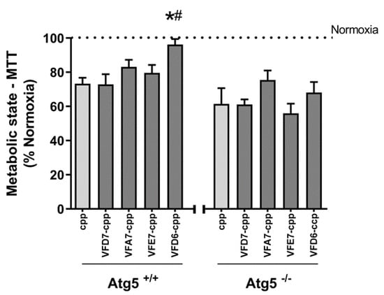 These experiments were performed to evaluate the possible pharmacological application of VFD7-cpp and additional selected peptides on cell viability, following an ischemic challenge. These experiments also contributed to investigate the possible biological significance of InPeps for cell viability following hypoxia-reoxygenation. Therefore, herein the effect of peptides was evaluated in wild type mouse embryonic fibroblasts cells (MEF) expressing Atg5 (Atg5+/+) and in the MEF missing autophagy pathway due to the lack of Atg5 (Atg5−/−); Atg5 is indispensable in both canonical and non-canonical autophagy [,]. Atg5+/+ and Atg5−/− MEF were cultured in a 96-well plate in DMEM high-glucose medium supplemented with 10% FBS and 1% penicillin/streptomycin, as previously described []. Cells were washed with PBS and incubated at 37 °C for 3 h in hypoxia buffer (NaCl 125 mmol/L, KCl 8 mmol/L, KH2PO4 1.2 mmol/L, MgSO4 1.25 mmol/L, CaCl2 1.2 mmol/L, NaHCO3 6.25 mmol/L, sodium lactate 5 mmol/L, and Hepes 20 mmol/L, pH 6.6) in a GasPak pouch (Becton Dickinson). Then the cells were re-exposed to oxygen, and the buffer was replaced by reoxygenation Krebs–Henseleit buffer (NaCl 110 mmol/L, KCl 4.7 mmol/L, KH2PO4 1.2 mmol/L, MgSO4 1.25 mmol/L, CaCl2 1.2 mmol/L, NaHCO3 25 mmol/L, glucose 15 mmol/L, and Hepes 20 mmol/L, pH 7.4) for 3 h. Treatments with 1μM of each peptide (cpp, VFD6-cpp, VFD7-cpp, VFA7-cpp, or VFE7-cpp) or control cpp alone commenced 30 min before ischemia and continued during hypoxia and reoxygenation. A booster with the same initial concentration of the peptide was added with the hypoxia buffer incubation and the reoxygenation buffer incubation. After the protocol, cell viability was measured by using tetrazolium salt 3-(4,5-Dimethylthiazol 2-yl)-2,5-diphenyltetrazolium bromide (MTT) assay; these assays measure the mitochondrial metabolic rate and indirectly reflect the viable cell numbers, which are the most commonly used method to evaluate the effect of compounds on cell viability on cultured cells []. MTT-based assay (Cell Counting Kit-8, Dojindo; Merck, São Paulo, SP, Brazil) was conducted according to the manufacturer’s instructions.