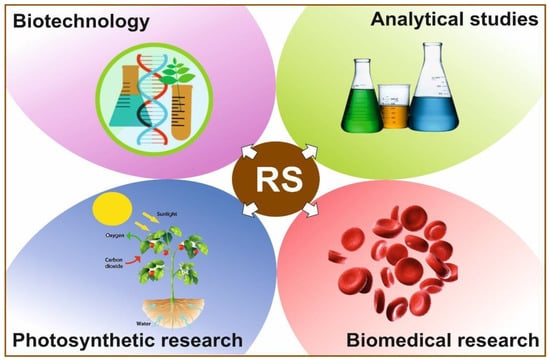 We have also covered studies on human cells [,] and microalgae [,] that we thought would be useful to introduce to the reader, especially in view of future studies of the use of algae. We have tried to cover the variety of algal species that have been used in different studies with the application of RS and its modifications. Figure 1 provides a schematic of the different research areas in which RS can be used. Biotechnological, biomedical, photosynthetic, and analytical research applications of RS are the main interest of this particular review.