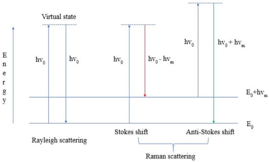 Figure 2 shows the energy transition of Rayleigh and Raman scattering. The former (Rayleigh) is based on the principle that the frequency of the absorbed and scattered photon does not change—elastic scattering. In the latter (Raman), on the other hand, there is a shift in frequency of the scattered photon (change in energy or change in wavelength)—inelastic scattering. It is also essential to note that Raman scattering is divided into Stokes and anti-Stokes shifts. The Stokes shift is more likely because it is associated with the shift of the binding maxima to the longer wavelengths (the energy and frequency of the scattered photon are correspondingly lower than those of the absorbed photon—see Figure 2). The anti-Stokes shift, on the other hand, is less likely. It results from the shift of the binding maxima to the shorter wavelengths (energy and frequency of the scattered photon are correspondingly higher than those of the absorbed photon—see Figure 2).