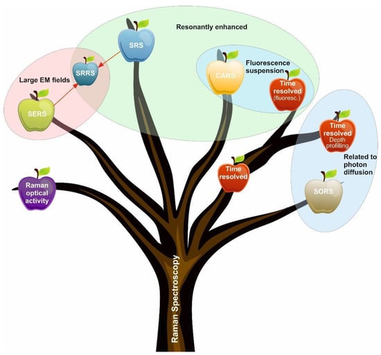“Family tree” of the RS. The relatively simple RS is the root of the complex surface-enhanced, resonance-enhanced time—and spatially-resolved techniques. Abbreviations: SERS, Surface-enhanced Raman Spectroscopy; CARS, coherent anti-Stokes Raman spectroscopy; RRS, resonance-enhanced Raman scattering; SORS, spatially offset Raman spectroscopy. Modified from Buckley and Ryder [].