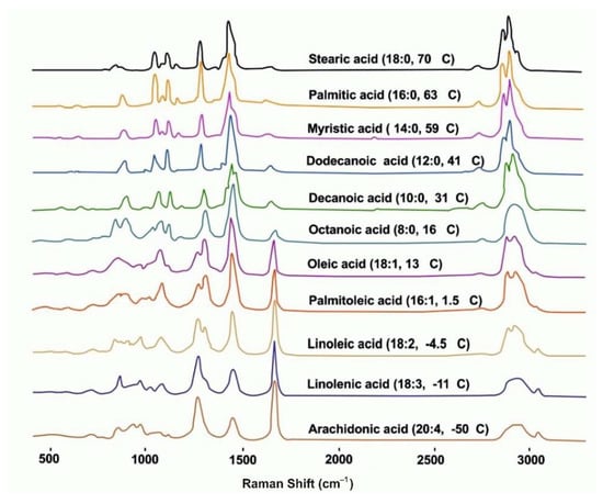 Several authors have shown that the RM methods are suitable for biodiesel production from microalgae to determine the FAs content. Wu et al. [] demonstrated a method for direct quantitative and in vivo lipid profiling of oil-producing microalgae using single-cell RS laser capture. This approach shows that lipids in microalgae determine the quantitative degree of unsaturation and the transition temperature. As the authors stated, the above factors can be measured on a single living cell of a microalga held in place with an optical trap while Raman data is collected. Raman is used in the study of FAs from microalgae for biofuel production and has shown analytical capabilities and quantification algorithms to be useful in many different organisms and lipidomics (Figure 6).