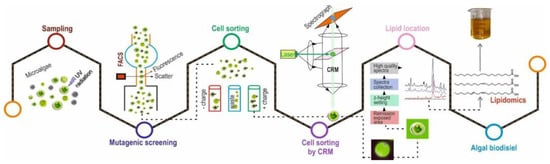 Thus, Raman spectrometer is used in microalgal biotechnology to screen species for highly concentrated fatty acid mutants []. There are two major strategies in algal biofuels development: bioprospecting and mutagenesis. This requires precise sorting and analysis of a large number of algal isolates containing TAG; FACS and ratiometric Raman analysis are the most suitable. Isolation of new algae from field samples can be carried out by UV mutagenesis to increase lipid production. FACS can be used to sample mutant populations and strains that alter lipid production during UV mutagenesis. Central to this workflow is confocal Raman microscopy, which allows for characterisation of the lipids produced by the algae in situ and rapid extraction of lipids from the cells. Raman hyper-spectroscopy is used to localise the lipid-rich region with a low pixel density, allowing faster Raman hyper-spectroscopy imaging. Confocal Raman microscopy characterises the lipid content (Figure 7).