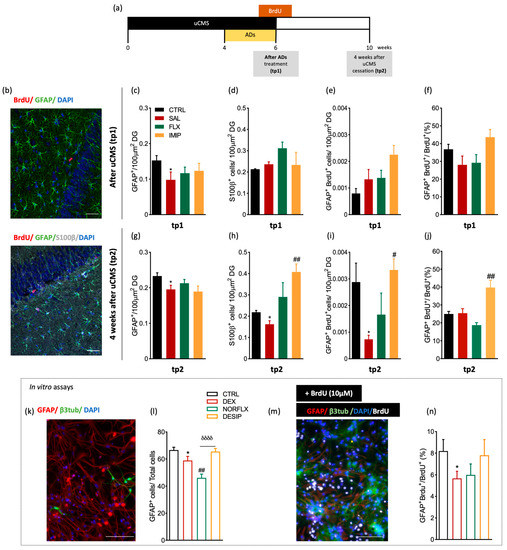 In vivo longitudinal analysis of astrocytic markers in the dorsal hippocampal dentate gyrus (dDG) of an animal model of depression and in in vitro primary cultures. (a) Illustrative experimental timeline. (b) Hippocampal DG coronal section immunostained for bromodeoxyuridine (BrdU) (in red), glial fibrillary acidic protein (in green), and DAPI (in blue). Additionally, a hippocampal DG coronal section immunostained for BrdU (in red), GFAP (in green), S100β (in grey), and DAPI (in blue). Quantitative analysis of GFAP+ cells in the dorsal dentate gyrus (dDG) at tp1 (c) and at tp2 (g), after a six-week uCMS protocol including antidepressants (ADs) treatment, fluoxetine, and imipramine. (d,h) Quantitative analysis of the number of S100β+ cells in the dDG, both at tp1 (d) and tp2 (h). (e,i) Quantitative analysis of GFAP+BrdU+ cells, both immediately after stress exposure, tp1, (e) and 4 weeks after stress exposure, tp2 (i). (f,j) Analysis of the number of GFAP+BrdU+ cells per total number of BrdU+ cells, both at tp1 (f) and at tp2 (j). (k,m) Representative image of immunocytochemistry of hippocampal primary cells in a control plate (k), and incubated with BrdU (m), with neurons labelled with β3-tubulin, astrocytes with GFAP proliferating cells with BrdU and cell nucleus with DAPI. (l,n) In vitro analysis of hippocampal DG primary cultures of p3–5 animals, regarding the number of GFAP+ astrocytic cells (l) and astrocytes differentiation—GFAP+BrdU+ (n) after incubation of the primary cell cultures with dexamethasone (DEX), norfluoxetine (NORFLX), or desipramine (DESIP) and BrdU. * Represents uCMS effect analyzed by Student’s t-test. # Represents ADs effect, by comparison of treatment and SAL animals; δ represents differences between ADs, analyzed by one-way analysis of variance (ANOVA). Data are represented as mean ± s.e.m. Scale bars represent 50 μm.*, # p < 0.05, ## p < 0.01, δδδδ p < 0.0001; Sample size: TP1: CTRL: 5–7; CMS: 5–7; FLX: 6–8; IMIP: 4–7; TP2: CTRL: 6–8; CMS: 6–9; FLX:6–8; IMIP: 6–8. Abbreviations: GFAP, Glial Fibrillary Acidic Protein; CTRL, non-stressed animals; SAL, animals exposed to uCMS and injected with saline; IMIP, animals exposed to uCMS and treated with imipramine; FLX, animals exposed to uCMS and treated with fluoxetine; dDG, dorsal dentate gyrus; DEX, dexamethasone; NORFLX, Norfluoxetine; DESIP, Desipramine; β3tub, β3-tubulin; DAPI, 4′,6′-diamino-2-fenil-indol; BrdU, Bromodeoxyuridine; tp1, time point 1 (6 weeks; immediately after the stress protocol cessation); and tp2, time point 2 (10 weeks; 4 weeks after the stress protocol cessation).