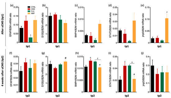 Relative mRNA expression levels of astrocytic and astrogliogenic related genes at tp1 and tp2 in the macrodissected DG. We analyzed the mRNA expression levels of GFAP (a,f), S100β (b,g), BMP4 (c,h), STAT3 (d,i), and jmjd3 (e,j) in macrodissected dentate gyrus tissue from control animals and uCMS-exposed animals treated either with saline, fluoxetine, or imipramine at tp1 and tp2. * Represents uCMS effect analyzed by Student’s t-test; # Represents ADs effect, by comparison of treatment and SAL animals, analyzed by one-way analysis of variance (ANOVA); and δ represents differences between ADs, analyzed by one-way analysis of variance (ANOVA). Data are represented as mean ± s.e.m. *, #, δ p < 0.05; Sample size: TP1: CTRL: 3–4; CMS: 4–6; FLX: 3–5; IMIP: 3–5; TP2: CTRL: 3–4; CMS: 3–4; FLX: 3–4; and IMIP: 3–4. CTRL, non-stressed animals; IMIP, animals exposed to uCMS and treated with imipramine; FLX, animals exposed to uCMS and treated with fluoxetine; SAL, animals exposed to uCMS and injected with saline; GFAP, Glial Fibrillary Acidic Protein; S100β, S100 calcium-binding protein β; BMP4, Bone morphogenetic protein 4; STAT3, Signal transducer and activator of transcription 3; JMJD3, histone H3 Lys 27 (H3K27) demethylase; tp1, time point 1 (6 weeks; immediately after the stress protocol cessation); and tp2, time point 2 (10 weeks; 4 weeks after the stress protocol cessation).