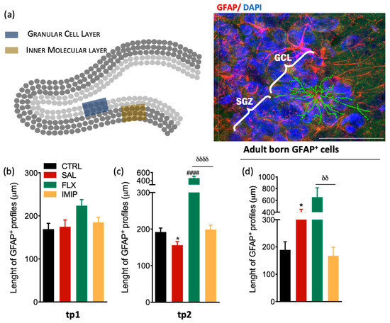 Morphological analysis of resident and newborn astrocytes in the hippocampal DG in a rat model of depression and after antidepressant treatment. (a) Representative scheme of the hippocampal DG regions where astrocytes were analyzed (left panel) and representative immunostaining and morphological analysis of GFAP+ cells in the hippocampal DG (right panel). (c,d) Longitudinal determination of the astrocytic length in the dorsal hippocampal dentate gyrus (dDG) in an experimental animal model of depression, at tp1 (b) and tp2 (c), specifically from GCL and IML. (d) Evaluation of astrocytic length in the granular cell layer (GCL) of the hippocampal DG newborn astrocytes, 4 weeks after cessation of the uCMS protocol and after treatment with fluoxetine and imipramine. These cells were identified by co-labeling GFAP+ and BrdU+ and were selected in the GCL to avoid stem cell analysis. * Represents uCMS effect analyzed by Student’s t-test. δ represents differences between ADs, analyzed by one-way analysis of variance (ANOVA). Data are represented as mean ± s.e.m. Scale bar represents 100 μm.* p < 0.05, δδ p < 0.01, ####, δδδδ p < 0.0001. Sample size: TP1: CTRL: 7; CMS: 10; FLX: 7; IMIP: 7; TP2: CTRL: 7; CMS: 10; FLX: 3–4; IMIP: 3–4; Adult-born GPAF+: CTRL: 5; CMS: 7; FLX: 5; and IMIP: 4. Abbreviations: GFAP, Glial Fibrillary Acidic Protein; CTRL, non-stressed animals; SAL, animals exposed to uCMS and injected with saline; IMIP, animals exposed to uCMS and treated with imipramine; FLX, animals exposed to uCMS and treated with fluoxetine; dDG, dorsal dentate gyrus, SGZ, subgranular zone; GCL, granule cell layer; tp1, time point 1 (6 weeks; immediately after the stress protocol cessation); and tp2, time point 2 (10 weeks; 4 weeks after the stress protocol cessation).