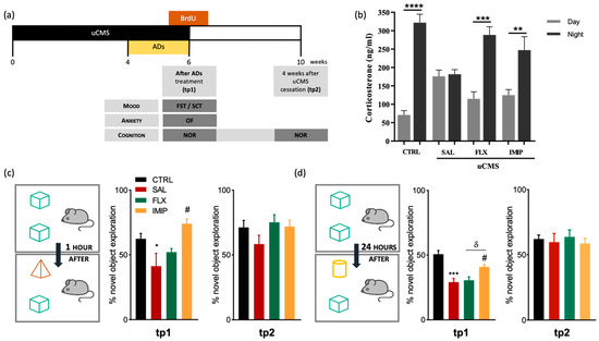 Treatment with imipramine rescues short-term and long-term memory deficits induced by chronic stress. (a) Representation of the current experimental timeline, including behavioral assessments and treatments. (b) Evaluation of corticosterone levels in rats blood serum, collected at nadir and zenith timepoints, at tp1 (immediately after the end of the uCMS protocol) (c,d) Evaluation of short- (c) and long-term memory (d) in the novel object recognition test (NOR), both at tp1 and tp2. * Represents uCMS effect analyzed by Student’s t-test; # Represents ADs effect, by comparison of treatment and SAL animals; and δ represents differences between ADs, analyzed by one-way analysis of variance (ANOVA). Data are represented as mean ± s.e.m. *, #, δ p < 0.05, ** p < 0.01, *** p < 0.001, **** p< 0.0001; Sample size: Corticosterone assay: CTRL: 12–14; CMS: 7–8; FLX: 8; IMIP: 6–10; TP1: CTRL: 10; CMS: 6; FLX: 8; IMIP: 8; TP2: CTRL: 10; CMS: 8; FLX: 8; and IMIP: 8. uCMS, unpredictable chronic mild stress protocol; AD, antidepressant; CTRL, non-stressed animals; IMIP, animals exposed to stress protocol and treated with imipramine; FLX, animals exposed to stress protocol and treated with fluoxetine; FST, forced-swimming test; NOR, novel object recognition; SCT, sucrose consumption test; SAL, animals exposed to stress protocol and injected with saline; OF, Open field test; tp1, time point 1 (6 weeks; immediately after the end of the uCMS protocol); and tp2, time point 2 (10 weeks; 4 weeks after the end of the uCMS protocol).