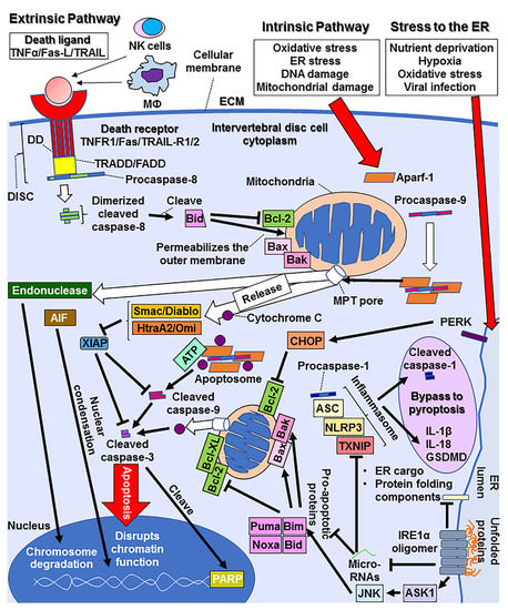 There are two types of apoptotic signaling pathways—intrinsic and extrinsic pathways [42]. The intrinsic pathway is triggered by cellular stresses such as oxidative stress [51,52], ER stress [48], DNA damage [64], and mitochondrial damage [42]. Following these stimuli, an initiator caspase, caspase-9, binds apoptotic protease activating factor-1 (Apaf-1) to induce a decline in mitochondrial membrane potential and opening of the mitochondrial permeability transition pore (MPTP) [35]. This leads to the release of mitochondrial cytochrome c, second mitochondria-activator of caspase (Smac/Diablo), high temperature requirement protein A2 (HtrA2)/Omi, apoptosis-inducing factor (AIF), and endonuclease [42]. Cytochrome c forms a complex with Apaf-1, procaspase-9, and ATP to form an apoptosome [42]. Apoptosomes recruit the active form of caspase-9 to subsequently cleave and activate the effector caspase caspase-3 to induce apoptosis [35]. Caspase-3 cleaves poly (ADP-ribose) polymerase (PARP) and suppresses its effect to deplete ATP [58]. This is attributed to the maintenance of ATP levels in apoptotic cells [58]. Smac/Diablo and HtraA2/Omi are accessory pro-apoptotic proteins that inhibit inhibitors of apoptosis proteins (IAPs) and help initiate apoptosis [35,65]. The release of AIF facilitates nuclear condensation and disrupts chromatin function [42]. Endonuclease activation promotes chromosomal degradation and other processes common between intrinsic and extrinsic pathways, including the destruction of the nuclear proteins and cytoskeleton, crosslinking of proteins, expression of ligands for phagocytic cells, and formation of apoptotic bodies [35]. The extrinsic pathway is initiated by binding of the death ligands and receptors, including TNF and TNF receptor 1 (TNFR1), Fas-L and Fas (alias CD95-ligand and CD95 or APO-1), and TNF-related apoptosis-inducing ligand (TRAIL) and TRAIL receptor 1/2 (alias Apo2-L and TRAIL-R1/2 or DR4) [35]. These ligands are secreted by natural killer cells or macrophages and bind to receptors on the surface of the target cells [35]. The initiator caspase for this pathway is caspase-8. Procaspase-8 interacts with the death domain (DD) that is a cytoplasmic module of death receptor and forms a death-inducing signal complex (DISC), and subsequently cleaves to the active form of caspase-8 [35]. In this process, an adaptor protein, such as Fas-associated death domain (FADD) or TNFR-associated death domain (TRADD) of DISC assists the interaction of procaspase-8 with DISC [35,66]. Dimerized and activated caspase-8 cleaves effector caspase-3 with or without the involvement of Smac/Diablo and HtraA2/Omi inhibition of X linked IAP (XIAP), depending on the cell type [67]. Previous studies have provided evidence of both intrinsic and extrinsic pathways in degenerated disc tissue [37,38,42]. Specifically, cells of the NP have been reported as type II cells, wherein they undergo the extrinsic apoptotic pathway [37]. Briefly, minute caspase-8 expression activates Bid (BH3 interacting domain death agonist) but does not activate caspase-3 directly; Bid heterodimerizing with Bax and Bak, and antagonized Bcl-2 and mitochondrial membrane permeability increases and pro-apoptotic proteins egress to the cytoplasm. The signaling following this is similar to the intrinsic pathway that recruits caspase-9 [37,67] (See Figure 1).