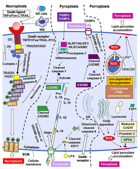 A scheme of necroptotic, pyroptotic, and ferroptotic signaling pathways. AIM2, absent in melanoma 2; ASC, apoptosis-associated speck-like protein; CoQ10, coenzyme Q10; DAMPs, damage-associated molecular patterns; DD, death domain; ECM, extracellular matrix; ER, endoplasmic reticulum; FADD, Fas-associated death domain; FSP, ferroptosis suppressor protein; GPX, glutathione peroxidase; GSDMD, gasdermin-D; GSDME, gasdermin-E; LPS, lipopolysaccharide; MLKL, mixed lineage kinase domain-like pseudokinase; NLRP, nucleotide-binding oligomerization domain (NOD)-like receptors family pyrin domain containing; NLRC, NOD-like receptors family caspase recruitment domain containing; PAMPs, pathogen-associated molecular patterns; PARP, poly (ADP-ribose) polymerase; PERK, pancreatic endoplasmic reticulum kinase; RIP, receptor-interacting proteins; ROS, reactive oxygen species; TNFR, TNF receptor; TRADD, TNFR-associated death domain; TRAIL, TNF-related apoptosis-inducing ligand; TRAILR, TRAIL receptor; TXNIP, thioredoxin-interacting protein; Ub, ubiquitination; XIAP, X linked inhibitors of apoptosis protein.