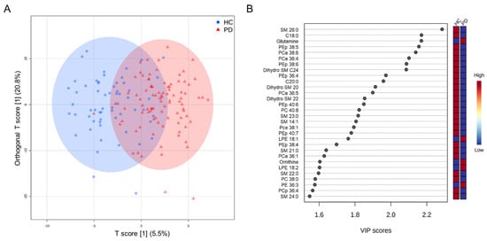 Orthogonal partial least squares-discriminant analysis (OPLS-DA) analysis between the healthy controls (HC, n = 60) and patients with Parkinson’s disease (PD) group (n = 92). (A) Orthogonal partial least squares discriminant analysis (OPLS-DA) demonstrates a separation of metabolites between two groups (R2Y = 0.22, Q2 = 0.15). R2Y, cumulative variation in the Y matrix; Q2, predictive performance of the model. (B) Top 30 metabolites with variable importance in the projection (VIP) score > 1.0 indicating their contribution to the classification in the OPLS-DA model. C: ceremide; LPE: lysophosphatidylethanolamine; PC: phosphatidylcholine; PCe: phosphatidylcholine-ether; PCp: phosphatidylcholine- plasmalogen; PEp: phosphatidylethanolamine-plasmalogen; SM: sphinogomyelin.