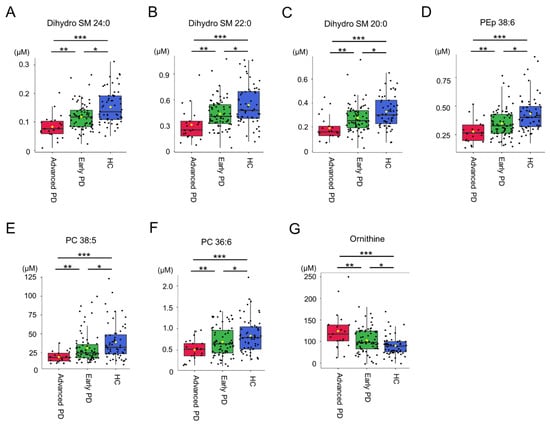 Differences in (A) dihydro sphingomyelin (SM) 24:0, (B) dihydro SM 22:0, (C) dihydro SM 22:0, (D) phosphatidylethanolamine-plasmalogen (PEp) 38:6, (E) phosphatidylcholine (PC) 38:5, (F) PC 36:6, and (G) ornithine among Parkinson’s disease (PD) patients at early (early PD) and advanced stages (advanced PD), and the healthy controls (HC). *: Statistically significant between early and advanced PD. p < 0.05, One-way analysis of variance with Bonferroni correction. **: Statistically significant between early PD and HC. p < 0.05, One-way analysis of variance with Bonferroni correction. ***: Statistically significant between advanced PD and HC. p < 0.05. One-way analysis of variance with Bonferroni correction.