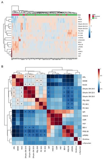 The correlations between identified metabolites and clinical parameters. (A) Heatmap of the hierarchical clustering. The dendrogram on top shows the clustering of patients, and the dendrogram on the side shows the clustering of features. The colors on top of the heatmap represent Parkinson’s disease patients at the early or advanced stage. The colors in the heatmap represent normalized intensities, scaled to mean of zero and unit variance for each feature. (B) Correlation matrix for clinical parameters and metabolites. Negative correlations are indicated with blue and positive correlations are indicated with red. *: Statistically significant correlations between clinical parameters and plasma levels of metabolites, p < 0.05, Pearson correlation. ADL: activities of daily living; BDI-II: Beck Depression Inventory II; CDR: Clinical Dementia Rating; HAM-D: Hamilton Depression Rating Scale; LEDD: Levodopa Equivalent Daily Dose; MMSE: Mini-Mental State Examination; MoCA: Montreal Cognitive Assessment; NPI: Neuropsychiatric Inventory Questionnaire; PDQ-39: Parkinson’s Disease Questionnaire; PC: phosphatidylcholine; PEp: phosphatidylethanolamine-plasmalogen; SM: sphingomyelin; UPDRS: Unified Parkinson’s Disease Rating Scale.