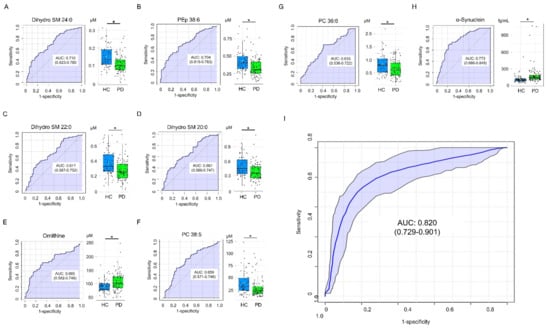 Diagnosis of PD using candidate metabolite markers. Receiver operating characteristic (ROC) curves and box plots for plasma levels of (A) dihydro sphingomyelin (SM) 24:0, (B) phosphatidylethanolamine-plasmalogen (PEp) 38:6, (C) dihydro SM 22:0, (D) dihydro SM 20:0, (E) ornithine, (F) phosphatidylcholine (PC) 38:5, (G) PC 36:6, and (H) α-synuclein for the diagnosis of Parkinson’s disease (PD). The area under the ROC curve (AUC) was in shadow. The black center line in box plots denoted the median, while the blue or green boxes contain the 25th to 75th percentiles. The black whiskers mark the 5th and 95th percentiles, and mean values were marked with yellow dots. *: Statistically significant between PD and the healthy controls (HC), p < 0.05, Two-tailed Student’s t-test. (I) ROC analysis on a combination of α-synuclein, dihydro SM 24:0, and PEp 38:6 by support vector machine. The 95% confidence band was in shadow.