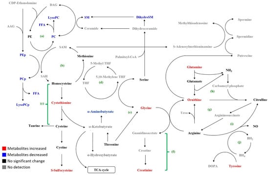 Map of metabolic changes in PD compared to the controls. (a) Sphingolipid and related glycerophospholipid biosynthetic pathways; (b) methionine cycle; (c) transsulfuration pathway; (d) folate cycle; (e) glycine, serine, and threonine pathway; (f) creatine synthesis pathway; (g) urea cycle; (h) ornithine–proline–glutamate pathway; (i) nitric oxide (NO) synthesis pathway; (j) biopterin cycle. AAG: alkyl acylglycerol; BH4: tetrahydrobiopterin; BH2: dihydrobiopterin; DAG: diacylglycerol; dihydroSM: dihydrosphingomyelin; DOPA: dopamine; FAA: free fatty acid; LysoPC: lysophosphatidylcholine; PC: phosphatidylcholine; PCp: phosphatidylcholine-plasmalogen; PE: phosphatidylethanolamine; PEp: phosphatidylethanolamine-plasmalogen; SM: sphingomyelin; SAM: S-S-adenosyl methionine; SAH: S-adenosyl homocysteine; TCA: tricarboxylic acid.