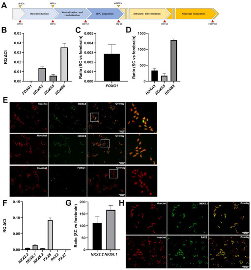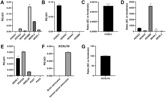 RNA extraction and real-time polymerase chain reaction (RT-PCR) were performed as described [36]. Analysis of gene expression was conducted using the following oligonucleotide primers: Taqman probes FOXG1, Hs01850784_s1; HOXA3, Hs00601076_m1; HOXA5, Hs00430330_m1; HOXB8, Hs00256885_m1; NKX2.2, Hs00159616_m1; NKX6.1, Hs00232355_m1; NKX6.2, Hs00752986_s1; PAX6, Hs01088114_m1; PAX3, Hs00240950_m1; PAX7, Hs00242962_m1; GFAP, Hs00909233_m1; S100B, Hs00902901_m1; CD44, Hs01075864_m1; GJA1, Hs00748445_s1; SLC1A2, Hs01102423_m1; SLC1A3/EAAT1/GLAST (EAAT1), Hs00904823_g1; AQUAPORIN-4 (AQP4), Hs00242342_m1; TFAP2A, Hs01029413_m1; REELIN, Hs01022646_m1; POTASSIUM INWARDLY RECTIFYING CHANNEL SUBFAMILY J MEMBER 10 (KCNJ10), Hs00158426_m1; AMIGO2, Hs00827141_g1; SERGLYCIN, Hs01004159_m1; COMPLEMENT C1S (C1S), Hs00156159_m1; COMPLEMENT C3 (C3), Hs00163811_m1; INTERLEUKIN-1BETA (IL-1β), Hs01555410_m1; TUMOR NECROSIS FACTOR ALPHA (TNF-α), Hs 00174128_m1; C-C MOTIF CHEMOKINE LIGAND 2 (CCL2), Hs00234140_m1; C-X-C MOTIF CHEMOKINE LIGAND 10 (CXCL10), Hs00171042_m1). Primer/probe sets were obtained from ThermoFisher Scientific. Data were normalized with BETA-ACTIN and GAPDH (ACTB Hs01060665_g1; GAPDH Hs02786624_g1). Relative quantification (RQ) was estimated according to the ∆Ct method; the ratio between the RQ of cells with spinal cord (SC) identity over the RQ of cells with forebrain identity was calculated using the ∆∆Ct method ([37] and references therein).