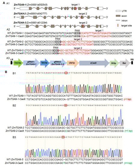 AtTGA9 and AtTGA10 are involved in regulating a common set of genes that contribute to tapetum and anther development []. ZmTGA9-1 (Zm00001d052543), ZmTGA9-2 (Zm00001d042777), ZmTGA9-3 (Zm00001d012294), ZmbZIP87 (Zm00001d038296), and ZmbZIP109 (Zm00001d023424) are the orthologs of TGA9 in Arabidopsis (Figure S1(A1)). However, only ZmTGA9-1, ZmTGA9-2, and ZmTGA9-3 are expressed during maize anther development based on RNA-seq data of W23 anther (Figure S1(A2)) [], indicating the potentially critical roles of the three genes in controlling maize male reproduction. Based on co-introduced of two vectors containing Cas9 and sgRNA expression cassettes into maize, our previous research revealed that ZmTGA9 triple mutant displayed complete male sterility, while single and double mutants of ZmTGA9-1/-2/-3 showed normal fertility []. However, the co-transformation method influences transformation efficiency and especially increases the complexity of molecular identification. To establish a more efficient method for simultaneously editing homologous GMS genes, in this study, we only transferred one CRISPR/Cas9 editing vector into maize to produce novel knockout-mutants of ZmTGA9-1/-2/-3, which further confirmed the function of the ZmTGA9 family on male fertility.