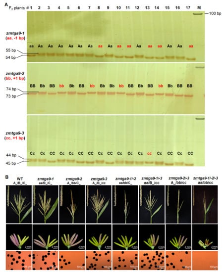 Co-segregating molecular marker genotyping and phenotypic characterization of ZmTGA9-1/-2/-3-Cas9 mutants in F2 population. (A) The genotypic identifications of representative ZmTGA9-1/-2/-3-Cas9 F2 individuals using developed co-segregating molecular markers. Molecular markers covering 1-bp deletion, 1-bp insertion and 1-bp insertion in the ZmTGA9-1/-2/-3 genes were detected by using PCR amplification with PAGE, respectively. M, marker. (B) Phenotypic analysis of tassels, anthers and pollen grains stained with 1% I2-KI solution in WT and the single-, double- and triple-gene homozygous mutants of ZmTGA9-1/-2/-3. A and a, B and b, and C and c represent the WT and mutant genotypes of ZmTGA9-1/-2/-3, respectively. A_/B_/C_ consists of AA/BB/CC, Aa/BB/CC, AA/Bb/CC, AA/BB/Cc, Aa/Bb/CC, Aa/BB/Cc, AA/Bb/Cc, and Aa/Bb/Cc genotypes. aa/B_/C_ consists of aa/BB/CC, aa/Bb/CC, aa/BB/Cc, and aa/Bb/Cc genotypes. A_/bb/C_ consists of AA/bb/CC, Aa/bb/CC, AA/bb/Cc, and Aa/bb/Cc genotypes. A_/B_/cc consists of AA/BB/cc, Aa/BB/cc, AA/Bb/cc, and Aa/Bb/cc genotypes. aa/bb/C_ consists of aa/bb/CC and aa/bb/Cc genotypes. aa/B_/cc consists of aa/BB/cc and aa/Bb/cc genotypes. A_/bb/cc consists of AA/bb/cc and Aa/bb/cc genotypes.