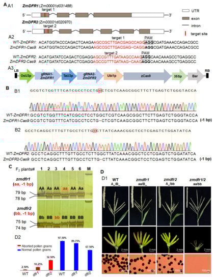 ZmDFR1 (Zm00001d031488) and ZmDFR2 (Zm00001d020970) are the orthologs of GMS genes OsTKPR1 and AtTKPR1 (Figure S1) [,], and the two genes are all preferentially expressed at anther developmental stages S8 to S9 (Figure S1(B2)). To explore their functions on male fertility in maize, we produced both single- and double-gene mutants of ZmDFR1/2 via the CRISPR/Cas9 system.