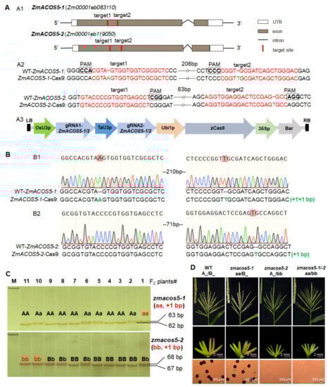 ZmACOS5-1 (Zm00001eb083110) and ZmACOS5-2 (Zm00001eb119050) are the orthologs of GMS genes AtACOS5 and OsACOS12 that play an important role in pollen formation and anther development (Figure S1) [,]. In addition, both ZmACOS5-1 and ZmACOS5-2 are highly expressed at maize anther developmental stages S8 and S9 (Figure S1(C2)). The roles of ZmACOS5-1/-2 in controlling male sterility remain unclear in maize. Therefore, we generated a double-gene mutant of ZmACOS5-1/-2 via the CRISPR/Cas9 system to unveil their functions on maize male fertility.