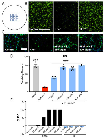 Figure 1A is a schematic of the nine fields of view that were automatically imaged per well to represent the total number of neurons remaining after 24 h in that well. Figure 1B captures a low-magnification image of control neurons, neurons exposed to iron for 24 h, and neurons treated with a representative HS and iron. This provides a visual example that the substantial loss of neurons caused by iron exposure is protected by HS.