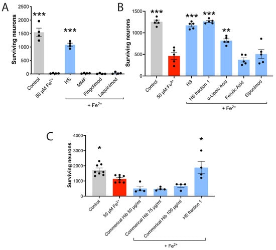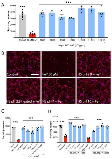 A concentration response of HS was next assessed against 50 or 100 µM of FeSO4. Against the lower concentration of iron, HS from 50 to 150 µg/mL completely protected mouse neurons against 50 µM of FeSO4. Against the higher 100 µM of FeSO4, HS at 50 µg/mL was partially protective, but higher concentrations of HS afforded complete protection (Figure 2D).