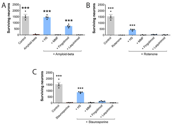 HS protects against other mediators of injury. Neurons were exposed to HS and the test medications for 1 h prior to amyloid-beta (20 µM) (A), rotenone (10 µM) (B) or staurosporine (200 nM) (C). Cells were harvested 24 h after for neuronal counts. HS was used at 100 µg/mL, while MMF was tested at 100 µM, fingolimod (FTY-720P) at 100 nM and laquinimod at 5 µM. All values are mean ± SEM, with each dot representing a well. *** p < 0.001 compared to the toxins alone (1-way ANOVA with Dunnett multiple comparisons).
