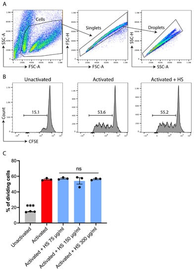 HS does not reduce the proliferation of T cells in culture. (A) FACS plots showing how the cells are evaluated. (B) CFSE plots where the humps to the left of the tall peak represent cycles of cell division. The % of dividing cells is also displayed. (C) Mean ± SEM of triplicate experiments. *** p < 0.001 (1-way ANOVA with Dunnett multiple comparisons) compared to activated controls. ns: not significant different from activated controls.