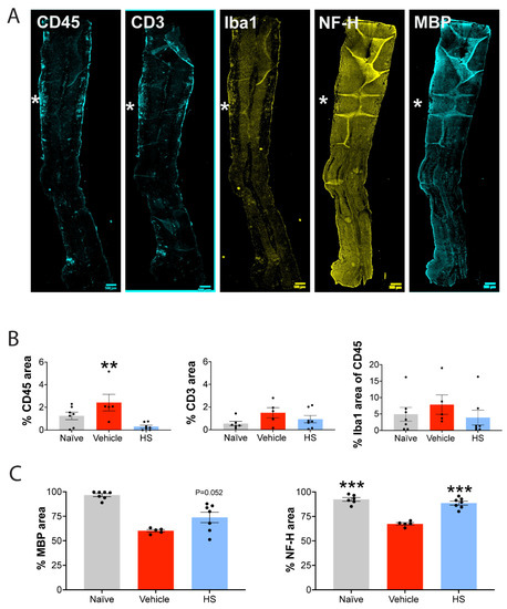 Mice were killed at day 24, and the spinal cord was processed for histological assessments of neuropathology. Figure 6B displays examples of stains in longitudinal sections of the spinal cord of EAE mice (vehicle treatment). An active lesion is informed by an aggregate of CD45+ leukocytes, some of which are CD3+ T cells and Iba1+ microglia/macrophages. As CNS lesions in EAE can vary in size and location, we quantified the histological outcomes by evaluating the thoracic spinal cord in longitudinal sections for each mouse. Figure 7A shows examples of longitudinal sections used for quantitation. The images are from a vehicle-treated EAE spinal cord stained for CD45 (immune cells), CD3 (T cells) or Iba1 (microglia/macrophages), or for the degree of myelin (myelin basic protein, MBP+) or axonal (neurofilament heavy chain, NFH) loss. Sections with a central canal were chosen for quantification to normalize location across mice. For quantitation, slide scanner images of both the right and left lateral columns were processed by ImageJ software for the total area per section bordered by the stain of interest, as described recently [57]. Of this, the area and thus the % covered by the thresholded stain was then obtained. In addition to the EAE-vehicle (control) or EAE-HS groups, naïve mice with no EAE induction were also assessed.