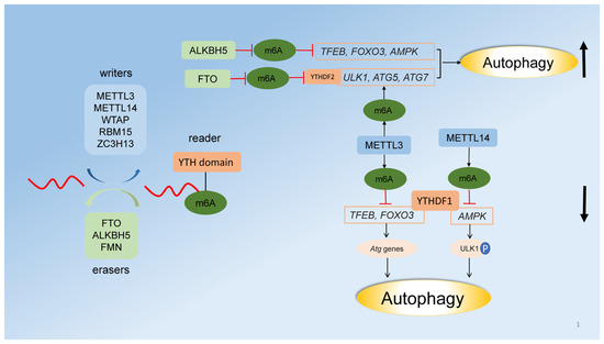 Schematic diagram of m6A modification and its regulation of autophagy. m6A modification is mediated by the methyltransferases (writers) METTL3, METTL14, WTAP, RBM15, and ZC3H13 and the demethylases (erasers) FTO, FMN, and ALKBH5. m6A indirectly affects RNA processing by recruiting reader proteins, which contain the YTH domain [79,80]. FTO upregulates UKL1, ATG5, and ATG7 expression to induce autophagy by YTHDF2-dependent targeting of their mRNA. ALKBH5 demethylates TFEB, FOXO, and AMPK mRNAs to activate autophagy. FOXO, TFEB, and AMPK are the targets of m6A reader protein YTHDF1. METTL3 increases m6A levels of UKL1, ATG5, and ATG7 to upregulate autophagy, whereas METTL3 and METTL14 negatively regulate autophagy through m6A methylation of TFEB, FOXO, or AMPK mRNAs, which are responsible for the expression of Atg genes or ULK1 phosphorylation. P indicates phosphorylation.