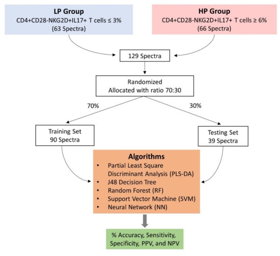 All preprocessed spectra from the LP and HP groups were combined. Furthermore, all spectra were randomized and allocated to either a training set or a testing set with a ratio of 70:30 using Weka software version 3.8.4. (The University of Waikato, Hamilton, New Zealand). The first classification model built was partial least square-discriminant analysis (PLS-DA) employing The Unscrambler®X software version 10.4 for Windows 64 bit (Camo Software AS, Oslo, Norway). Various other classification models, including the J48 decision tree, random forest (RF), support vector machine (SVM), and neural network (NN) were created using Weka software version 3.8.4. with the same dataset used in PLS-DA. Specifically, for NN algorithms, hidden layers in the range 1–20 were applied to obtain the best classification model. After creating the classification models, the testing performance of each classification model was measured in terms of % accuracy, sensitivity, specificity, positive predictive value (PPV), and negative predictive value (NPV) (Figure 1).