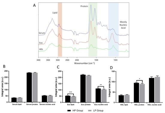 Results of spectral band area analysis of serum, exosome, and HDL spectra. Representative spectra from serum (blue), exosome (red), and HDL (green). Regions selected for the spectral band area analysis were 3000–2800 cm−1 lipid (orange region), 1700–1500 cm−1 protein (green region), and 1270–960 cm−1 nucleic acid (blue region) (A). The comparison of spectral band area between the LP and HP groups based on serum (B), exosome (C), and HDL spectra (D); * = p < 0.05; ** = p < 0.01; *** = p < 0.001.
