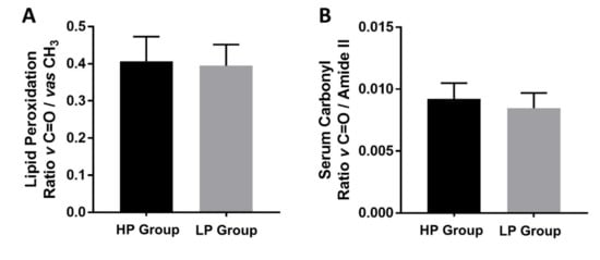 The study of oxidative stress levels by using serum spectra showed that lipid peroxidation and protein carbonyl levels were not statistically different between the LP and HP groups (p > 0.05). However, the trend of the data showed that the LP group had lower oxidative stress based on the ratio v C=O to vas CH3 and v C=O to amide II.