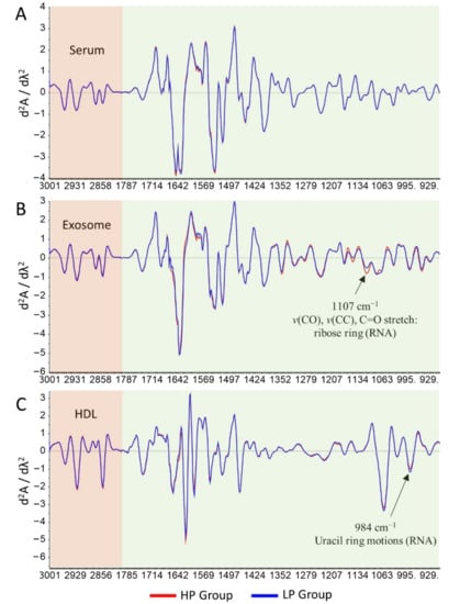 Before performing the discrimination using unsupervised analysis and advanced machine learning algorithms, we attempted to visually analyze the difference of spectra from the LP and HP groups, employing the second derivative spectra (Figure 4). Unfortunately, the patterns of the second derivative spectra of serum, exosome, and HDL from the two groups were similar. The differences were only found in the band intensity of exosome (1107 cm−1 assigned to v (CO) and v (CC)) and HDL (984 cm−1 assigned to uracil ring motions of RNA) [51]. Those differences in band intensities were not enough to classify the LP and HP groups. The principal component analysis (PCA) and partial least square-discriminant analysis (PLS-DA) uncovered several important bands from spectra of exosomes to discriminate between the LP and HP groups (Table 5). The prominent spectral bands and proposed biomolecular assignments for the HP group were at bands 1651 cm−1 (α-helix amide I) and 1541 cm−1 (amide II). Bands at 1670, 1626, and 1555/8 cm−1 were bands associated with the LP group. A band at 1670 was a vibration of amide I (anti-parallel β-sheet), v (C=C) trans, lipids, and fatty acids. Spectral peaks at 1629 and 1626 cm−1 were assigned to β-sheet amide I region structure. The last bands at 1555/8 consisted of ring base vibration [51,62,63,64,65]. In general, the spectral peaks associated with the LP and HP discrimination from exosome spectra were associated with differences in protein, lipid, and nucleic acid biomolecules. In agreement with our findings, several studies employing exosome bio component analyses also found that proteins, lipids, and nucleic acids underwent biochemical composition alterations under various inflammation mediated diseases [66,67,68].