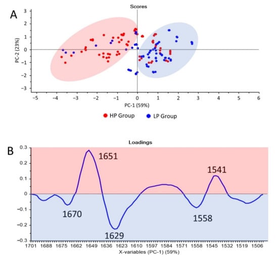 Analysis of the PCA loading plots was used to determine the regions of the FTIR spectrum which contributed the most to the clustering. Bands at 1670, 1629, and 1558 cm−1 had a contribution to clustering the LP group in the PC-1 positive score plot. Bands at 1651 and 1541 cm−1 were important for the HP group (Figure 5B).