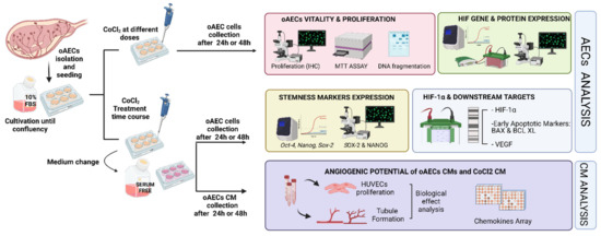 Experimental design. After oAECs isolation and culture until confluency, cells were treated or not with different CoCl2 concentrations for 24 and 48 h. Analysis on cell vitality and proliferation was firstly conducted to identify the optimal dose for further investigations. Then, in cells treated with CoCl2 concentrations at various time points, gene and protein expression of HIF-1α and its downstream targets were analysed. Finally, angiogenic assays investigations were performed on collected conditioned media (CM).