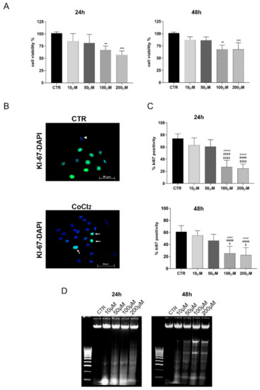 Dose-response assessment of CoCl2 on oAEC viability and proliferation. For this experiment, cells were treated with 0 (CTR), 10, 50, 100, and 200 µM of CoCl2 for 24 and 48 h of incubation. (A) The histograms show oAECs’ viability of untreated (CTR) and CoCl2-treated cells detected with the MTT assay. Data are expressed as a percentage of vital cells ± SEM obtained from experimental triplicates for each biological sample (n = 3 different animals). CTR viability was set as 100%. (B) Representative IHC images showing the nuclear localization of the proliferation marker KI-67 (green fluorescence) in oAECs cultured for 48 h in the absence (CTR, upper image) or presence of CoCl2 (lower image). Nuclei were counterstained with DAPI (blue fluorescence). Arrowheads indicate negative stemness nuclear localization in the cells, and arrows indicate positivity. Scale bar: 50 µm. (C) Histograms displaying the incidence of KI-67 positive cells recorded in CTR and CoCl2-treated oAECs at 24 and 48 h. The incidence value was expressed as a percentage of KI-67 positive cells/100 total cells ± SEM, obtained from triplicate experiments performed on three different biological samples. Values statistically different for ** p < 0.01, *** p < 0.001, **** p < 0.0001 vs. CTR, #### p < 0.0001 vs. 10 µM CoCl2, and $ p < 0.05, $$$$ p < 0.0001 vs. 50 µM. (D) Representative agarose gel showing DNA fragmentation in CTR and CoCl2-exposed oAECs after 24 h and 48 h of culture.