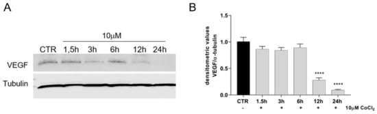 Analysed VEGF expression, in untreated oAECs (CTR) and 10 µM CoCl2-treated oAECs. (A) Representative Western blot image of VEGF expression in a time course experiment conducted at 1.5 h, 3 h, 6 h, 12 h, and 24 h. (B) Densitometric values of VEGF were normalized on Tubulin expression. Data were expressed as mean ± SEM values of samples, each performed in triplicate, obtained at least three different animals. Values statistically different for **** p < 0.0001 vs. CTR.