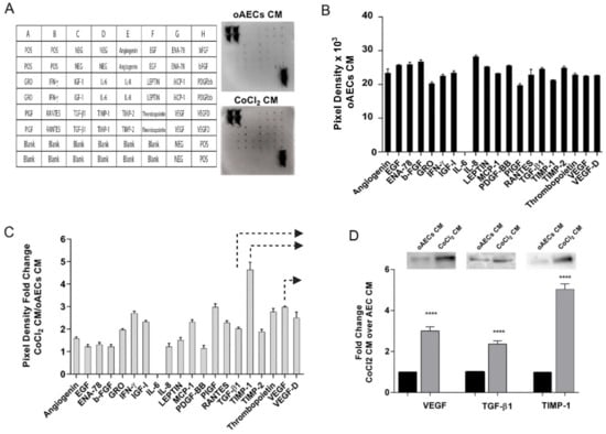 Angiogenic factors profile expression. (A) The layout of the array and representative images of chemokines detection. (B) Quantification by densitometric analysis of antibodies array of untreated oAECs CM, collected after 24 h after medium change. (C) Angiogenic proteins profile expression of CoCl2 CM. Data are expressed as fold changes versus untreated oAECs CM values. Arrows indicate the angiogenic factors further analysed in WB. (D) Representative WB images of VEGF, TGF-β1, and TIMP-1 protein content in untreated oAECs CM and CoCl2 CM, collected after 24 h after medium change. Densitometric values are expressed as fold changes versus untreated oAECs CM values. Values statistically different for **** p < 0.0001 vs. oAECs CM.