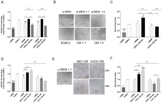 The pro-angiogenic effect induced by chemical hypoxia was then biologically tested by exposing HUVEC culture to CM. To this aim, CM were collected after 24 or 48 h from AEC’s pre-treatment (6 h) with or without 10 µM CoCl2